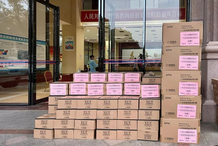 12月19日,广东省大爱相髓慈善基金会携手香雪制药向东莞市大朗镇黎贝岭村委会捐赠一批粤抗1号凉茶植物饮料、医用口罩等,助力东莞大朗抗疫,在精神及物资上给予一线工作人员支持与鼓励。