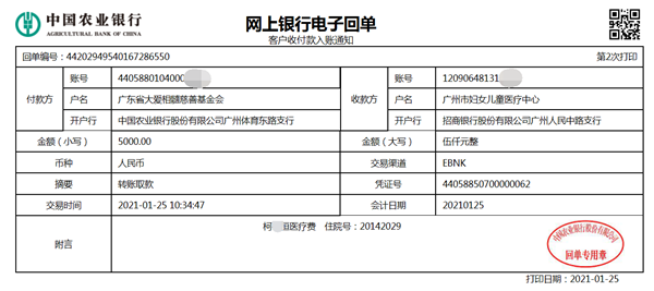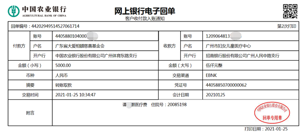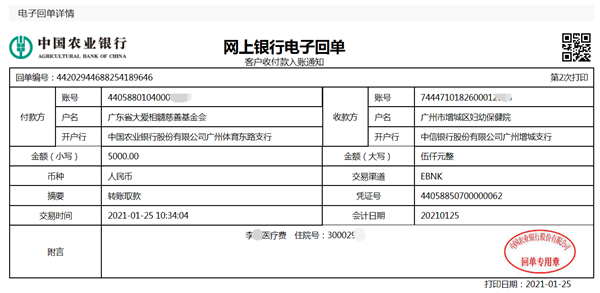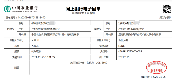 医疗资助款基金会工作人员已通过银行快速转账的方式向广州市妇女儿童医疗中心拨付。