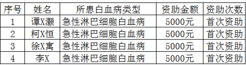 目前,疫情还在发展,形势依然严峻。广东省大爱相髓慈善基金会在全力做好疫情防控工作的前提下,统筹推进“天使在行动”儿童白血病专项资助工作的进行。本月基金会工作人员根据已递交申请资助的白血病儿童的治疗进度、家庭收入状况、治疗费用情况等认真审核后,确定分别给予这4位小朋友首次5000元的医疗资助。