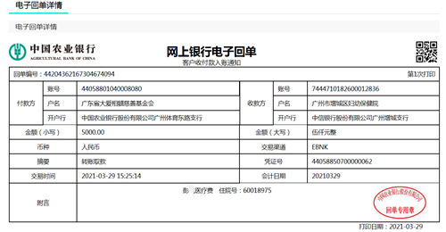 医疗资助款基金会工作人员已通过银行快速转账的方式向广州市妇女儿童医疗中心拨付。