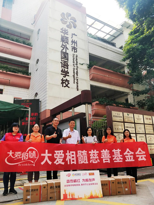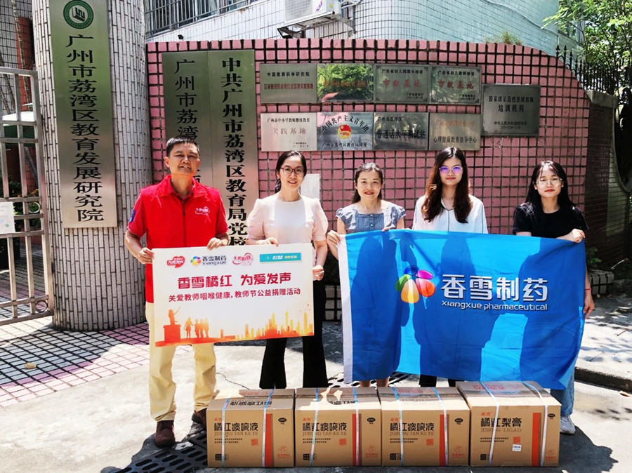 广东省大爱相髓慈善基金会携香雪制药、集和堂大药房、员村街道商会向广州市华颖学校捐赠橘红痰咳液、橘红梨膏,守护教师咽喉健康。