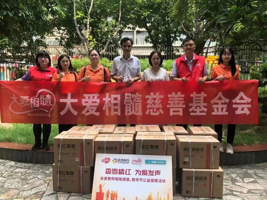 9月9日,广东省大爱相髓慈善基金会携手香雪制药、海王星辰健康药房、广东仁惠堂大药房、集和堂大药房、员村街道商会开展“香雪橘红 为爱发声”公益活动。向广东工程职业技术学院,广州市荔湾区教育发展研究院,广州市天河区职业高级中学,广州市天河华颖外语学校,广州市天河第一小学等多所学校、教育机构的老师和教育工作者捐赠了一批橘红痰咳液、橘红梨膏爱心物资,向一直以来尽职尽责,兢兢业业,辛勤付出和默默奉献的老师们表示亲切慰问和崇高敬意!