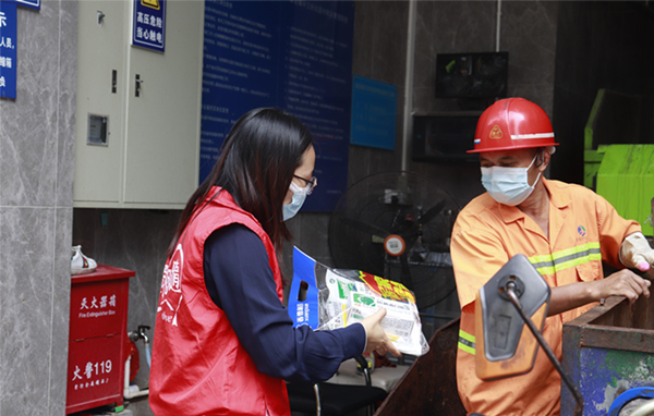 每天清晨,环卫工人一把扫帚,一个簸箕,一辆手推车,穿梭在大街小巷,晨出晚归,用一人脏换来万家净。每时每刻城市环境的维护都离不开环卫工人,正是环卫工人们的辛勤付出,才为我们营造了美好的工作和生活环境!广东省大爱相髓慈善基金会会党员代表,香雪制药代表,信息工程学院师生代表为环卫工人派送香雪制药健康包,并与他们亲切交谈。