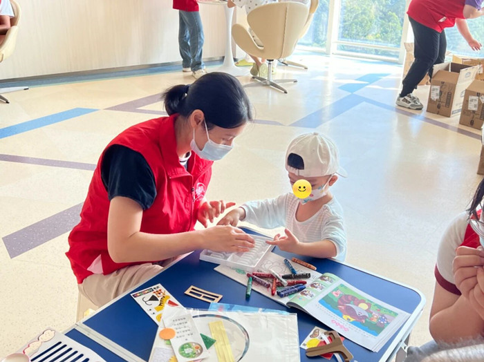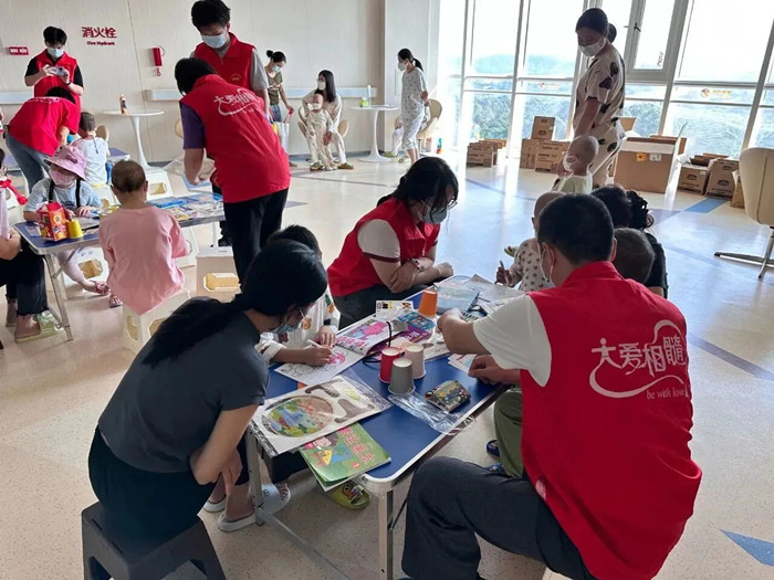 (志愿者陪小朋友一起画画,做手工)