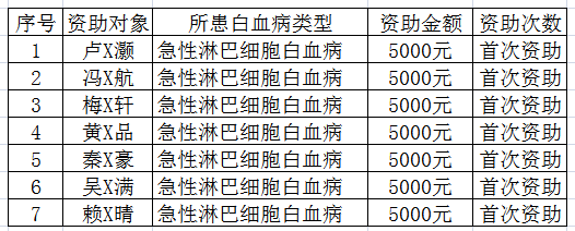 尊敬的爱心人士、亲爱的大爱相髓家人们、长期关注大爱相髓公益事业的社会人士……,广东省大爱相髓慈善基金会本着“生命相髓,传递大爱”的宗旨,积极弘扬中华民族善良、博爱、感恩、互助等美德,为帮助困境中的白血病儿童家庭,减轻高昂治疗费用所带来的经济压力和精神负担。广东省大爱相髓慈善基金会工作人员在公平、公正、公开的原则下,根据已递交申请资助的白血病儿童的治疗进度,治疗费用情况,家庭经济收入状况等,认真审核后确定分别给予了以下7位小朋友首次5000元的医疗资助,资助总金额3.5万元。现将资助情况公示如下: