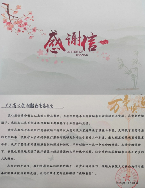 为感谢大家对市妇女儿童医疗中心医护人员及住院患者的关怀与支持,市妇女儿童医疗为受邀参会的单位颁发了感谢信。广东省大爱相髓慈善基金会秘书长黄淑雯代表基金会上台接受感谢信。