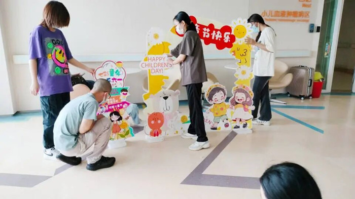 5月31日下午,基金会工作人员与志愿者们早早来到病房活动区,用汽球,卡通饰品,KT板背景墙等对病区活动区进行了布置,让小朋友们感受到浓浓的“六一”儿童节氛围。