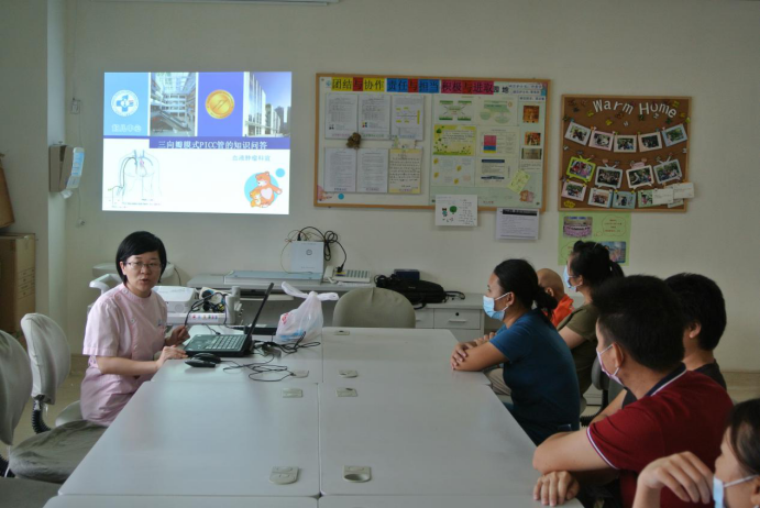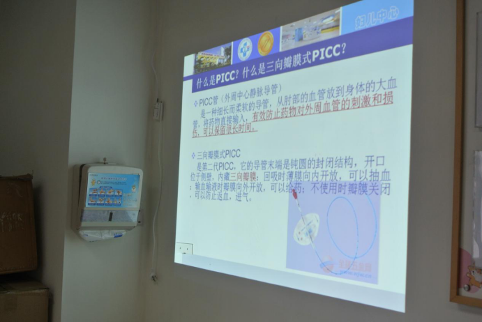 会上,黄海英护士长通过PPT向在座患者家长详细介绍了PICC管的重要性,日常维护等注意事项,所谓PICC,其实就是外周穿刺置入中心静脉导管(Peripherally Inserted Central Catheter)的英文缩写,是一种从周围静脉导入且末端位于中心静脉的深静脉置管技术。PICC置管对于血液科的白血病小朋友来说就是一条生命线,大量的化疗药、营养液等对外周血管的损伤特别大,有了这条管路就能避免反复静脉穿刺所导致的机械性静脉炎或化疗药物外渗的化学性静脉炎与组织坏死,但置管后也会存在一些并发症的问题,因此,做好患者PICC置管健康教育十分重要。