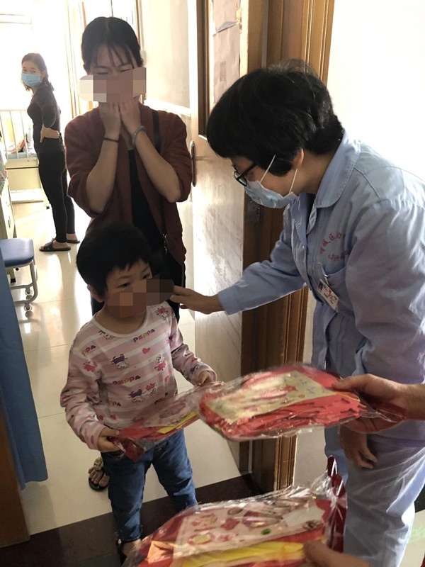 林雅雯护长给小朋友送手工灯笼,赞扬小朋友在治疗期间的坚强勇敢