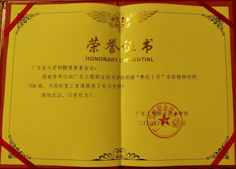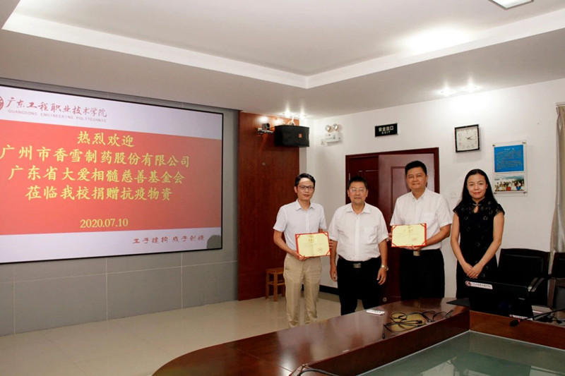 为表彰此次的爱心捐赠行动,广东工程职业技术学院分别给广东省大爱相髓慈善基金会,香雪制药颁发了荣誉证书,感谢此次公益举措为学校复工复课提供了有力支持。